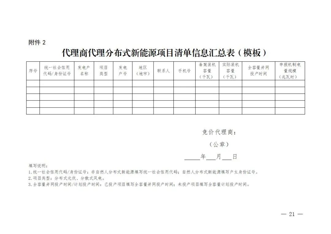 (2)分布式新能源项目。自然人户用项目应提交户主法定身份证明;非自然人项目应提交项目备案文件、营业执照、法定代表人法定身份证明。如非户主或非企业法定代表人办理,还需提供经办人法定身份证明、竞价授权委托书。竞价授权委托书模板见附件1。