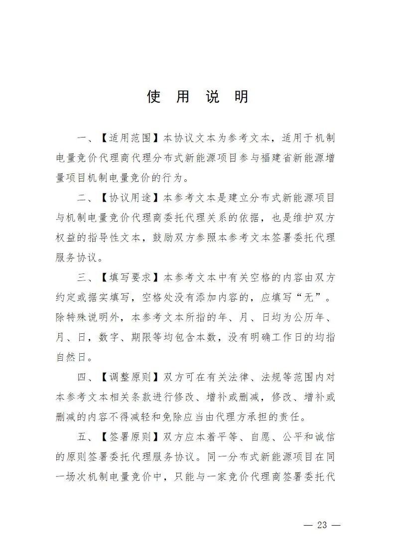 分布式新能源项目可以直接或者委托竞价代理商(以下简称“代理商”)申报竞价。现阶段,代理商为在福建电力交易中心注册生效(含省外推送)的售电公司或虚拟电厂。代理商应与所代理的分布式新能源项目签订委托代理竞价协议。代理商可参与不同年度、不同场次的竞价,在同一场次竞价中所代理的分布式新能源项目总容量上限暂定为20万千瓦,后续根据分布式新能源发展情况调整代理规模上限。任一分布式新能源项目在同一场次竞价中仅可委托一家代理商。