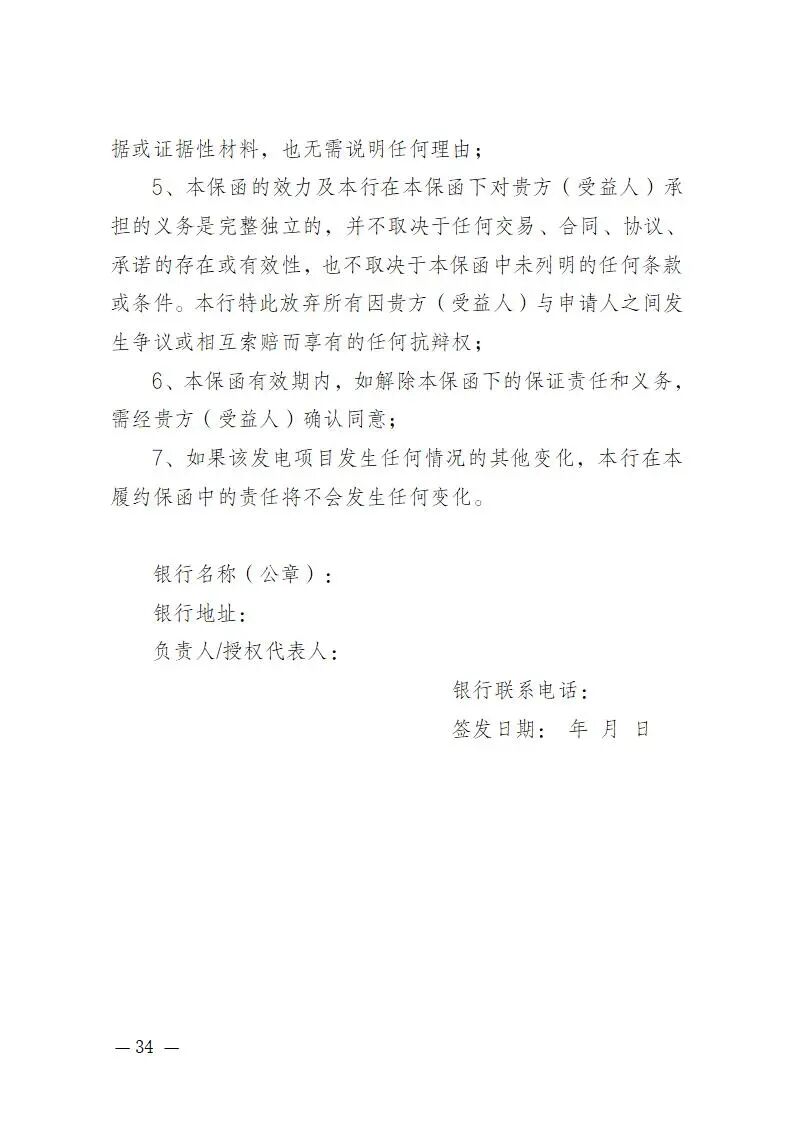 未投产的新能源项目需提交银行开具的、符合国家规定的履约保函;代理商应为代理的未投产项目提交一份共用履约保函;已投产项目原则上不提交履约保函;直接参与竞价的户用自然人分布式光伏用户暂免交履约保函。履约保函的有效期限至少应覆盖项目申报投产日期的次月1日至项目申报投产日期后240个自然日。履约保函模板见附件4。